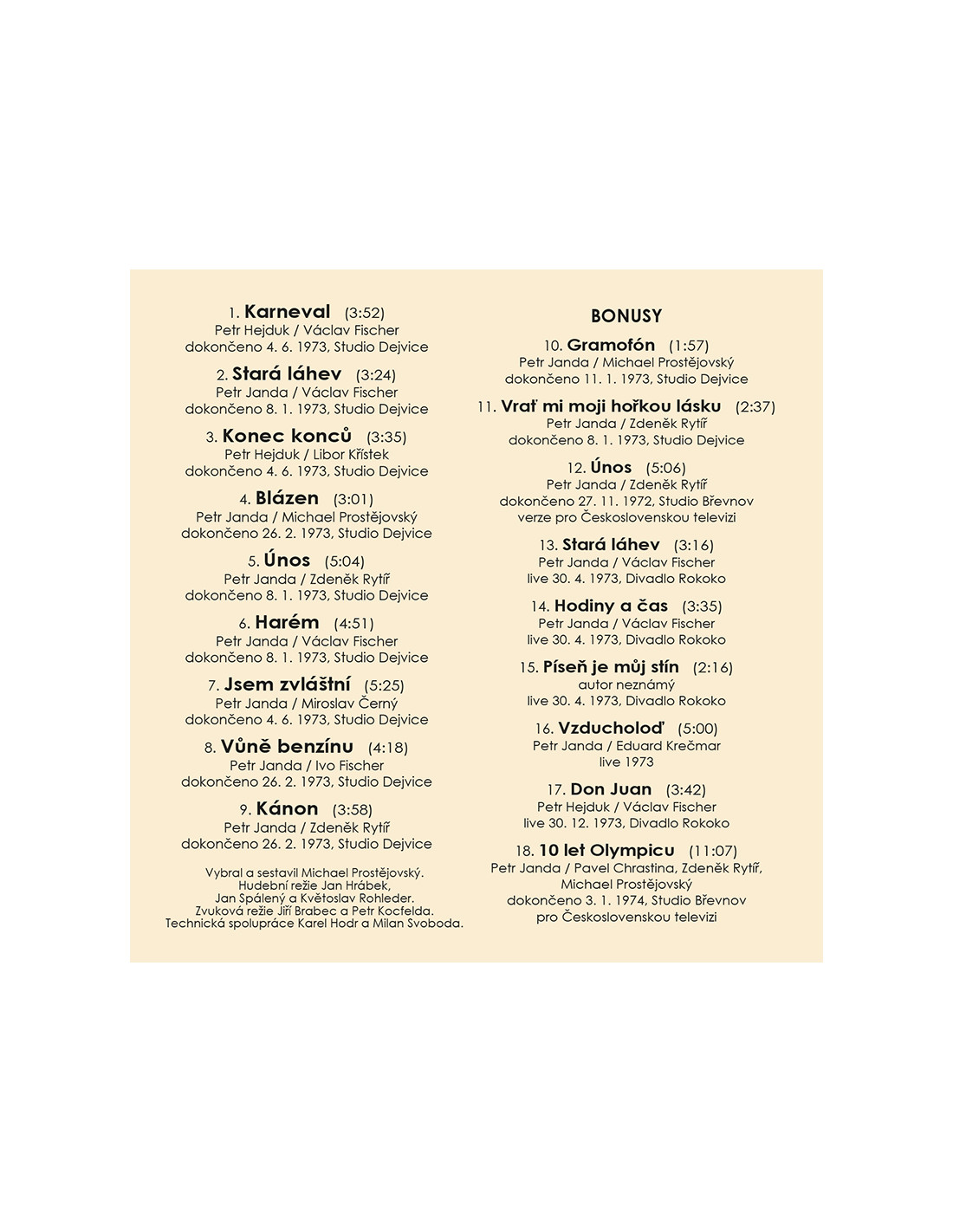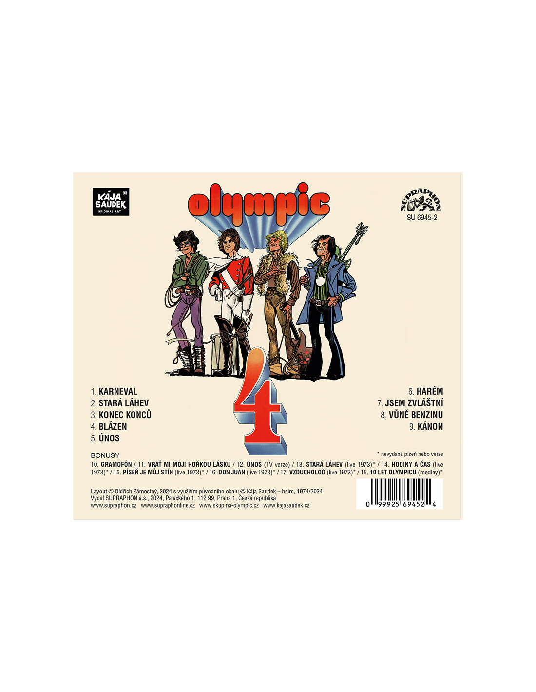 Základní albová sada nahrávek vyšla v roce 1974, je tedy výročně co připomínat. Bylo to období olympicky turbulentní, když rock se míchal s popem a na pozici baskytaristy se střídali muzikanti. Vedle Ladislava Chvalkovského to byl Jiří Korn, přicházející z hvězdných The Rebels, ale souběžně rozjíždějící samostatnou mainstreamovou kariéru. Jeho vokální podíl, ať již sólový či ve vícehlasech, byl zcela nepřeslechnutelný, stejně jako podíl písniček z pera bubeníka Petra Hejduka. Petr Janda a Miroslav Berka zůstali z původní sestavy sami, kolegové v kapele, a také muzika kolem nich se proměnila: Olympic nabíral nový dech a hledal cestu dál. Ze skladeb si určitě vybavíte dramatický Únos, ale dobu dokreslují i další stylově různorodé písničky, často ozdobené skvělými vokály. To vše je umístěno v obalu s dokonalými ilustracemi Káji Saudka, včetně jedné původně nevyužité. Jako tradičně se na CD všem badatelům dostává bohatého přídavku v podobě devíti studiových a koncertních bonusů, s osudy detailně popsanými ve fotografiemi vyzdobeném bookletu. Z historického pohledu „Čtyřka“ možná nepatří mezi olympická absolutně top alba, ale jako pokračování vývoje a přeskupování sil před velkým třeskem v podobě příchodu trvalého basáka Milana Brouma je nezbytností pro fandy a zajímavostí pro všechny ostatní.